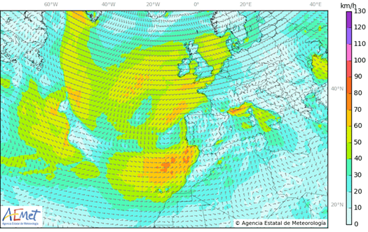 Además, es determinante observar la evolución de la trayectoria prevista de la borrasca y su posición final antes de introducirse en el continente. En el caso de Emma, y para suerte en Canarias, a pesar de haber sostenido vientos muy fuertes alrededor de su seno, de más de 120 km/h, la borrasca quedará un tanto alejada de las islas, y por poco también, la zona de vientos más intensos del sistema, siendo en general el suroeste peninsular donde ocurran fenómenos adversos más intensos relacionados con este fenómeno (ver imagen 3).