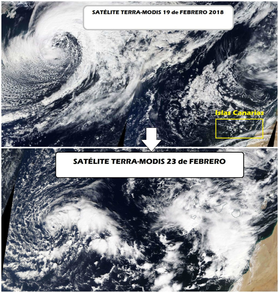 Pero la clave está en que estos sistemas no tocan tierra con la misma fuerza con la que se desenvuelven en mitad del océano, sobre todo en el caso de Canarias, en donde en no pocas ocasiones el sistema se ve debilitado muy rápidamente al encontrarse sobre temperaturas superficiales del océano inferiores o no tan cálidas en las islas como las que puede disfrutar frente a la costa este estadounidense habitualmente. En otras ocasiones se encuentra con bloqueos anticiclónicos sobre el norte africano que le impiden avanzar, encuentran cizalladura en altura, o cuando absorben aire continental desde el desierto sahariano, aire habitualmente más pobre en niveles de humedad. En conclusión, por muy fuertes que veamos estos sistemas antes de llegar, en el océano, luego cuando comienzan a interactuar con masas de tierra o masas oceánicas no tan propicias para su desarrollo, estos sistemas evolucionan, cambian y en ocasiones, pierden intensidad o se organizan de forma distinta, como ya ocurrió con la borrasca del pasado viernes 23 en Canarias (imagen 2), que nació como borrasca polar, con una estructura asimétrica y un frente frío desarrollado y visible, pero que evolucionó adquiriendo características tropicales, estructura simétrica y convección moderada cerca de su seno antes de llegar a las islas, aunque reduciendo drásticamente su rango de acción.